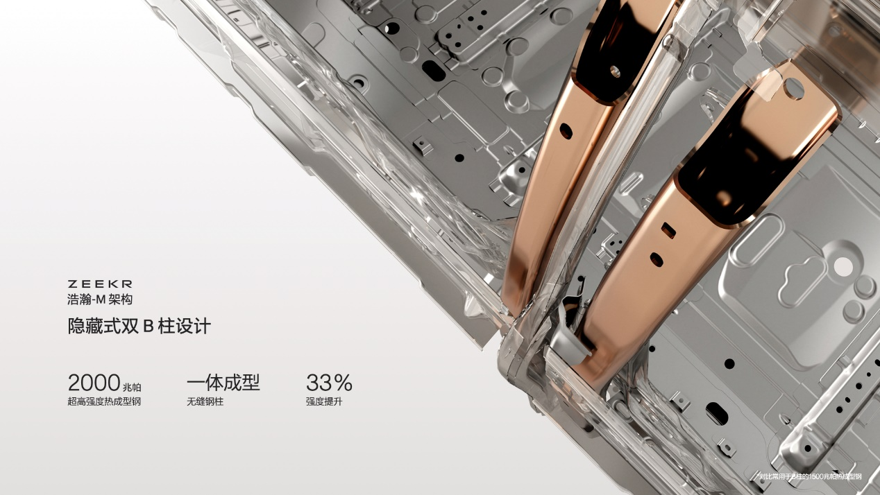 作为将安全写进基因的品牌,极氪同样将浩瀚-M 架构的安全做到了极致。浩瀚-M 架构采用了极氪首创的「隐藏式双 B 柱设计」,相较传统 B 柱材料强度提升了 33%,在每一侧的车门内,都装备了两根直径约 70 毫米的超高强度钢柱,且每根钢柱都采用 2000 兆帕超高强度热成型钢,与建造潜艇的材料强度相当,并通过热气胀一体成型工艺,确保从内到外,没有任何缝隙。