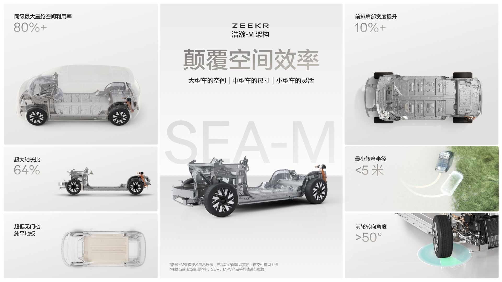 进入智能电动时代,虽然发动机不再是必须品,但汽车空间形态依旧停留在燃油时代。带着对未来出行的全新思考,极氪投资 70 亿人民币,专属开发了浩瀚-M 架构,颠覆了目前电动汽车的空间形态,重构未来出行空间,打造出未来的电动车架构,让智能电动时代的汽车空间彻底超越过往。