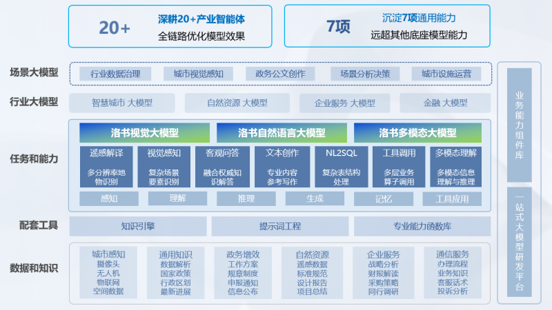 洛书大模型是高性能、高效率的自然语言处理模型,洛书基础大模型具有多模态、多任务处理能力,通过对大量数据的深度学习,具备了在视觉感知、遥感识别、数据分析、文本写作、工具调用等多个领域的强大性能,在实际应用中能够更好地应对复杂场景,提高生产效率。同时,洛书大模型注重领域知识工程的构建,通过集成专业能力函数库,使其在解决实际产业问题时具有更高的准确性和可用性。