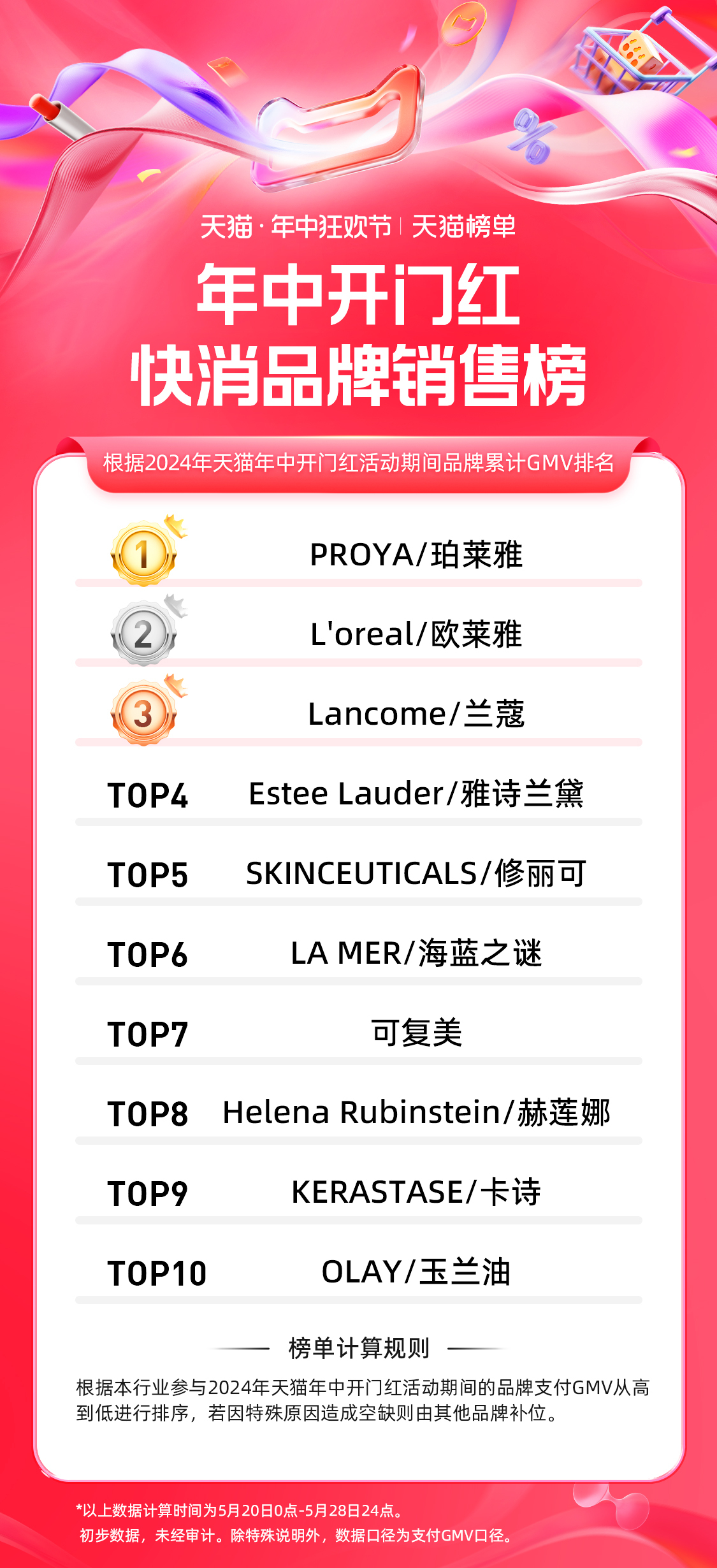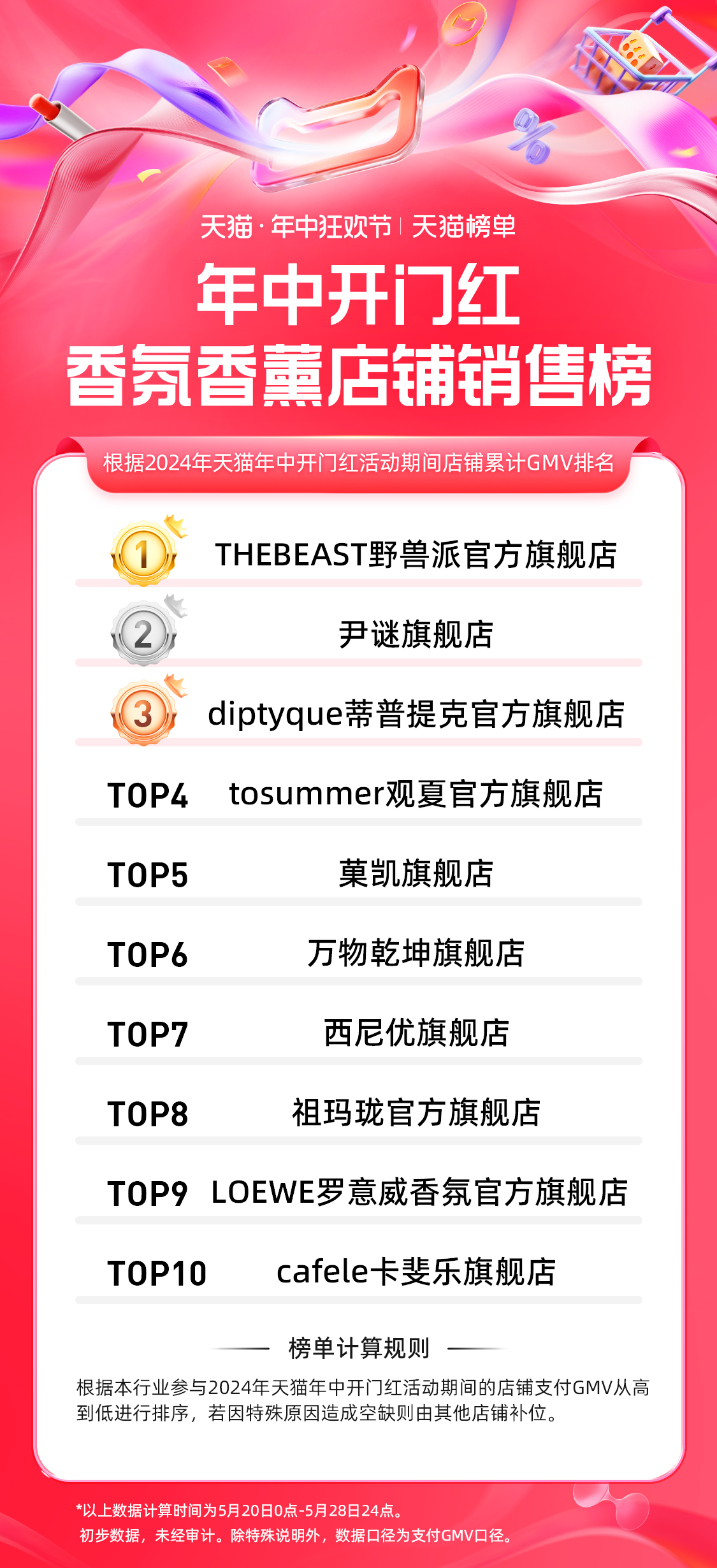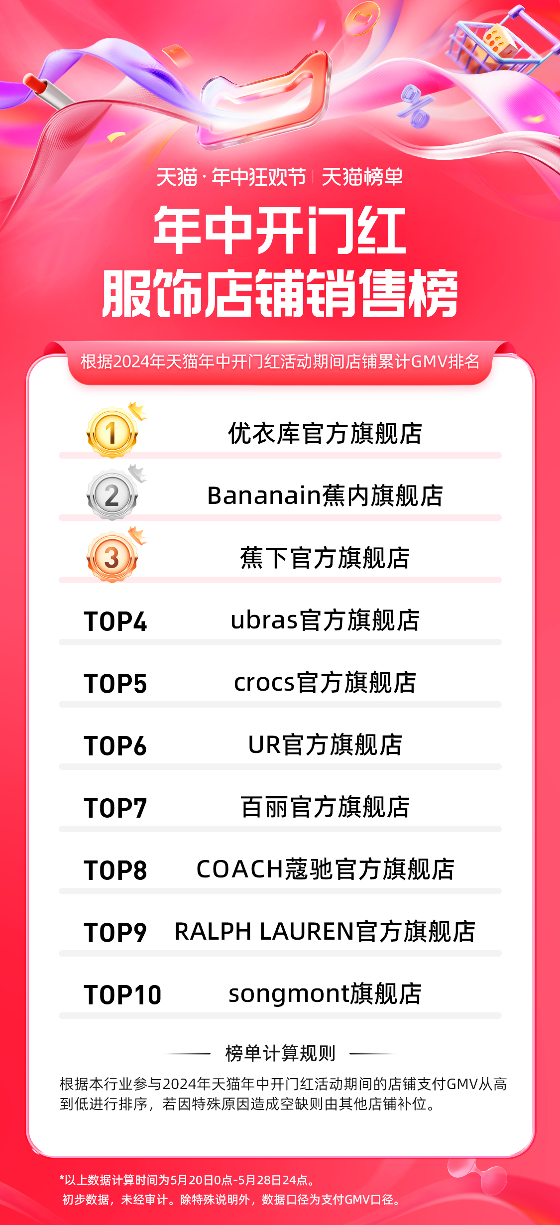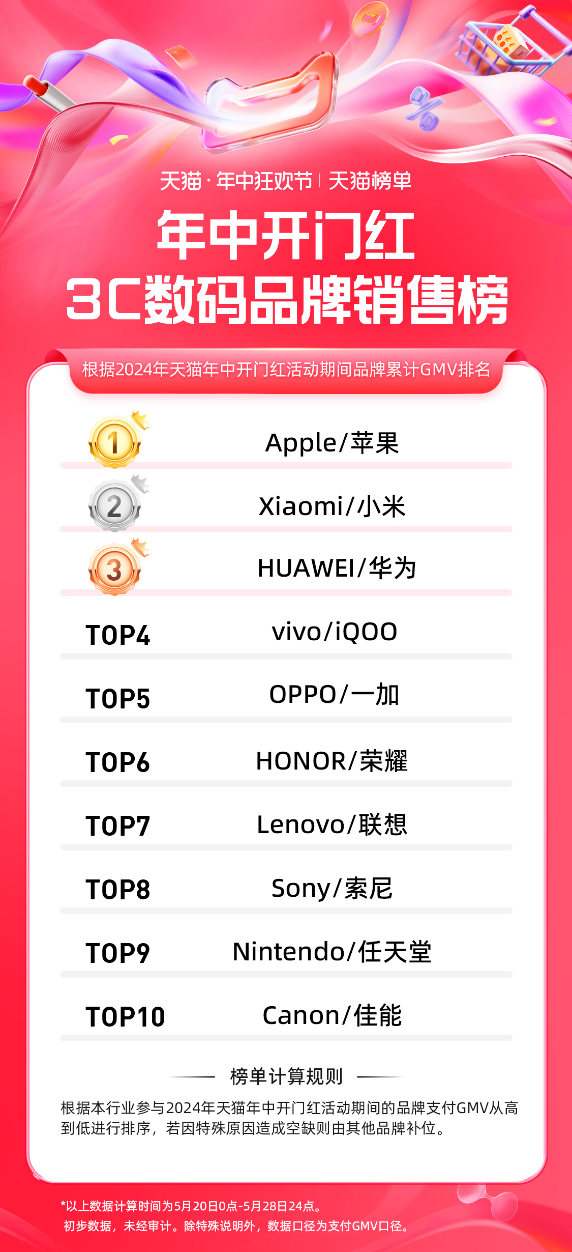5 月 30 日,天猫 618 第一阶段(5.20-5.28)品牌成交排行榜发布,快消、服饰、运动户外、家享生活、3C 数码、玩具潮玩、健康、香氛香薰、宠物、食品、生鲜、汽车、文教、珠宝饰品等行业的领跑品牌、商家出炉。