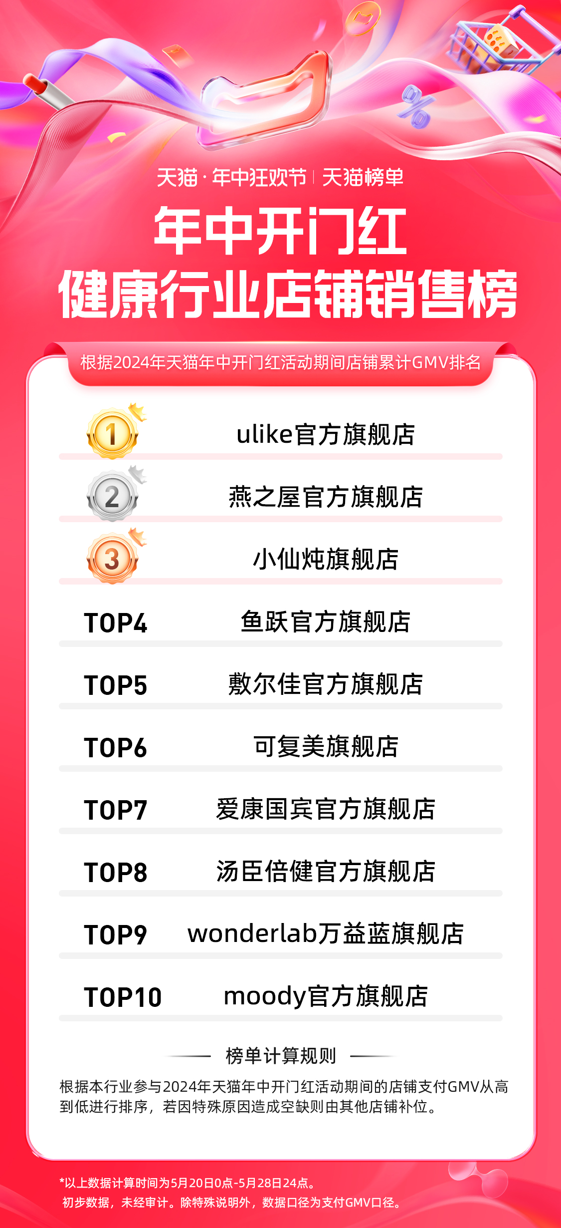 10、天猫 618 第一波健康行业店铺排行榜: