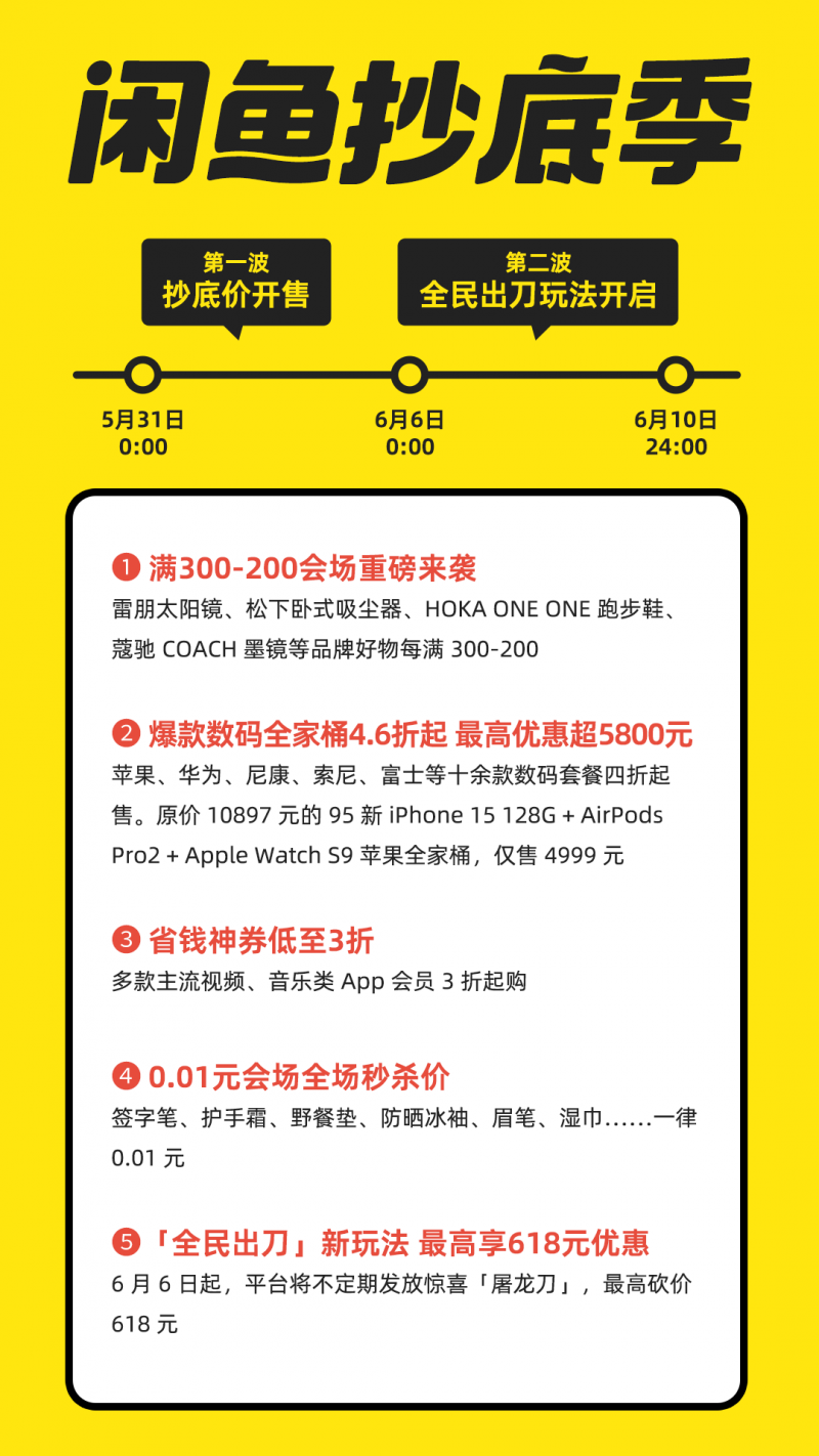 据悉,闲鱼抄底季将于 5 月 31 日 0 点开启,6 月 10 日结束,为期 11 天。消费者可分两波参与,第一波为 5 月 31 日 0 点到 6 月 5 日 24 点捡漏抄底价;第二波从 6 月 6 日 0 点到 6 月 10 日 24 点「全民出刀」玩法上线,用户可对宝贝小刀砍价、组 2 人小刀团,平台还将不定期发放惊喜「屠龙刀」,最高 618 元。