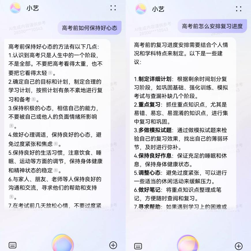 高考一场考试长达好几个小时,这对于考生的身心状态都是一种考验,规律的作息和科学合理的饮食习惯能够有效提高学习时的注意力,关于备考方面的问题,如考前的复习规划、考前心态调整等,考生们也可以寻求小艺的帮助,小艺都能够快速给出科学合理的建议。