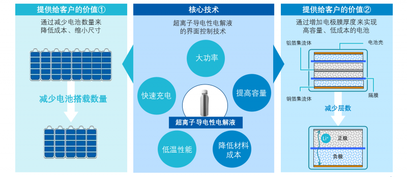 该电解液因溶剂中含有乙腈,因此拥有传统电解液难以实现的高离子导电性,凭借旭化成原创的电解液配制技术※2 和电极/电解液界面控制技术※3,一举攻克了当前 LIB 面临的两个课题,即同时「提高低温输出和高温耐久性」。上述技术使提高输出和快速充电等成为可能,通过减少电动汽车等搭载的电池数量或增加电极膜厚度,为提高电池容量和降低成本做贡献。