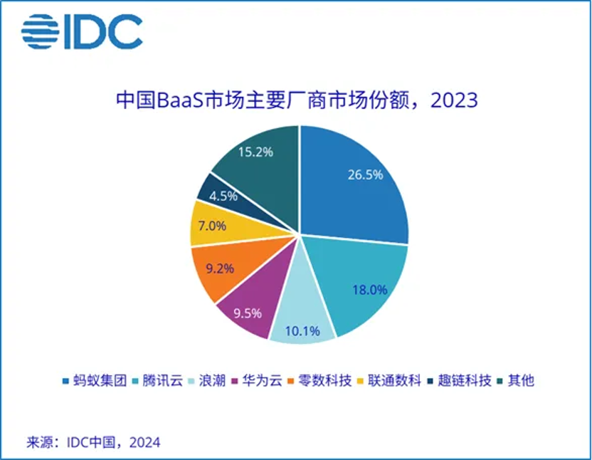 IT 市场研究和咨询公司 IDC 于今日发布了《中国 BaaS 市场份额,2023》。2023 年,中国 BaaS 市场以 23.7% 的增速实现 18.9 亿元人民币的市场规模。IDC 数据显示,区块链整体市场集中度进一步增强,蚂蚁集团凭借蚂蚁链以 26.5% 的市场占有率位居首位,腾讯云、浪潮分列二、三名。据了解,这也是蚂蚁链连续第四年位列中国 BaaS 市场第一名。