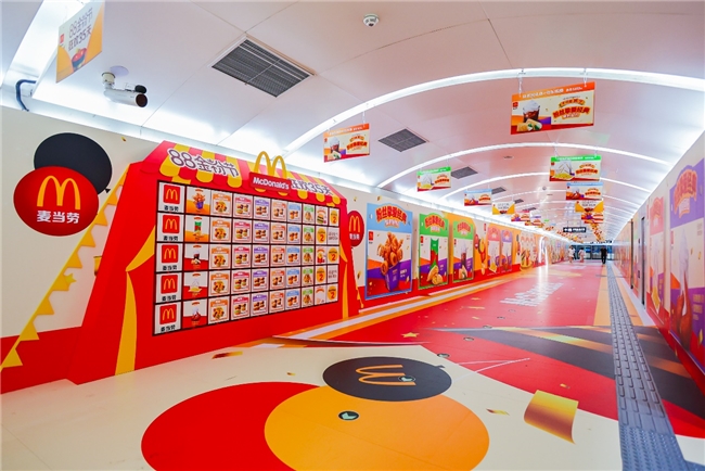 7 月, 随着麦当劳「88 金粉节」的到来, 品牌与北京地铁通成的合作再升级。在北京地铁国贸站这一京城地标性站点, 麦当劳以其不可能「折」学主题画面, 打造了一场视觉与互动的地铁创意盛宴。在这个为品牌粉丝打造的专属空间里, 翻转装置上的明星套餐优惠, 不仅吸引了乘客的目光, 更激发了他们的参与热情。而专为乘客设置的打卡区, 汉堡、薯条等明星产品被放大数倍, 可爱的造型吸引了大量乘客拍照合影, 将麦当劳粉丝的欢乐与优惠分享至社交平台, 迅速转化为线上流量。