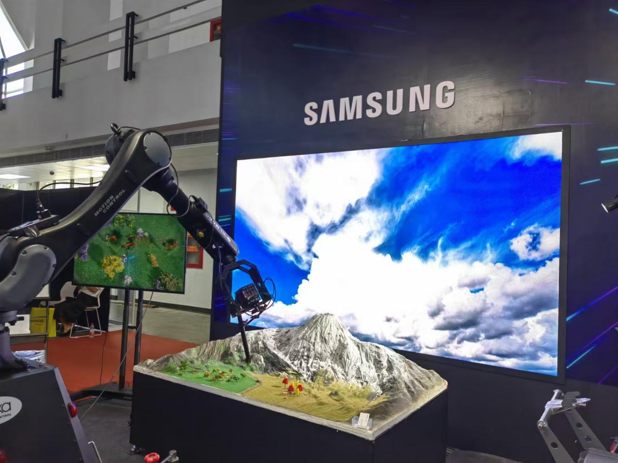 展会现场,微缩景观营造出自然盛景,迷你小人穿梭于广袤的草原与巍峨的高山间,在三星 The Wall 虚拟制作专用显示屏打造的环绕包裹式场景下,一部旅行大片伴随着徒步者的前行在即刻间完成拍摄,实现「所见即所得」。众所周知,当使用摄像机在显示器屏幕上拍摄影像时,会出现闪烁线,The Wall 虚拟制作专用显示屏拥有 12,288 Hz 的 LED 频率,可有效减少闪烁线和伪影。此外,由于使用多台设备,确保各画面的信号与整个系统的信号同步非常重要。The Wall 虚拟制作专用显示屏具有 Genlock 和相位偏移功能,能有效避免丢帧或双帧现象。该产品通过定向技术优化供了专业演播室设置所需的各项功能,为广告与影视制作行业提供了高水准、高品质的虚拟拍摄空间,使角色完全融入环境,营造出高端质感。