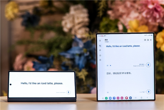例如在一场商务会议上,用户可以充分利用三星 Galaxy Z Fold6 创新的双屏对话模式,实现更直观的同传翻译体验。在面对面交流的过程中,双方可各自在内、外屏无缝查看对话内容翻译,让用户畅通无阻的与国外嘉宾、同事展开社交、讨论。用户甚至无需手持手机,只要将手机旋停放置桌面,便能坐下来畅谈。当外籍嘉宾演讲时,用户还可以在立式交互模式下开启聆听模式,通过屏幕呈现的同传翻译深入理解发言内容。