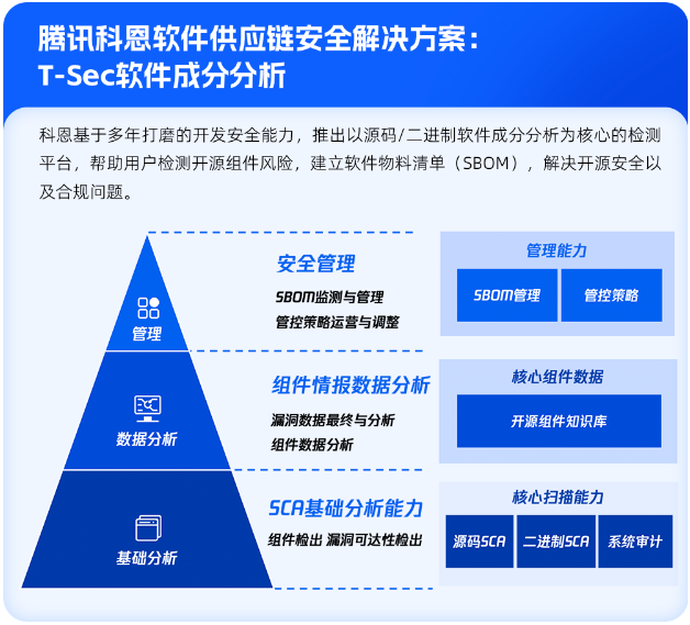腾讯安全认为,开源组件的风险可以分为四大类:漏洞风险、开源许可证合规风险、投毒风险以及供应连续性风险,为了解决这个问题,腾讯安全科恩实验室基于多年打磨的开发安全能力,推出以源码和二进制软件成分分析为核心的检测平台,帮助用户检测开源组件风险、建立软件物料清单,并解决开源安全以及合规问题。