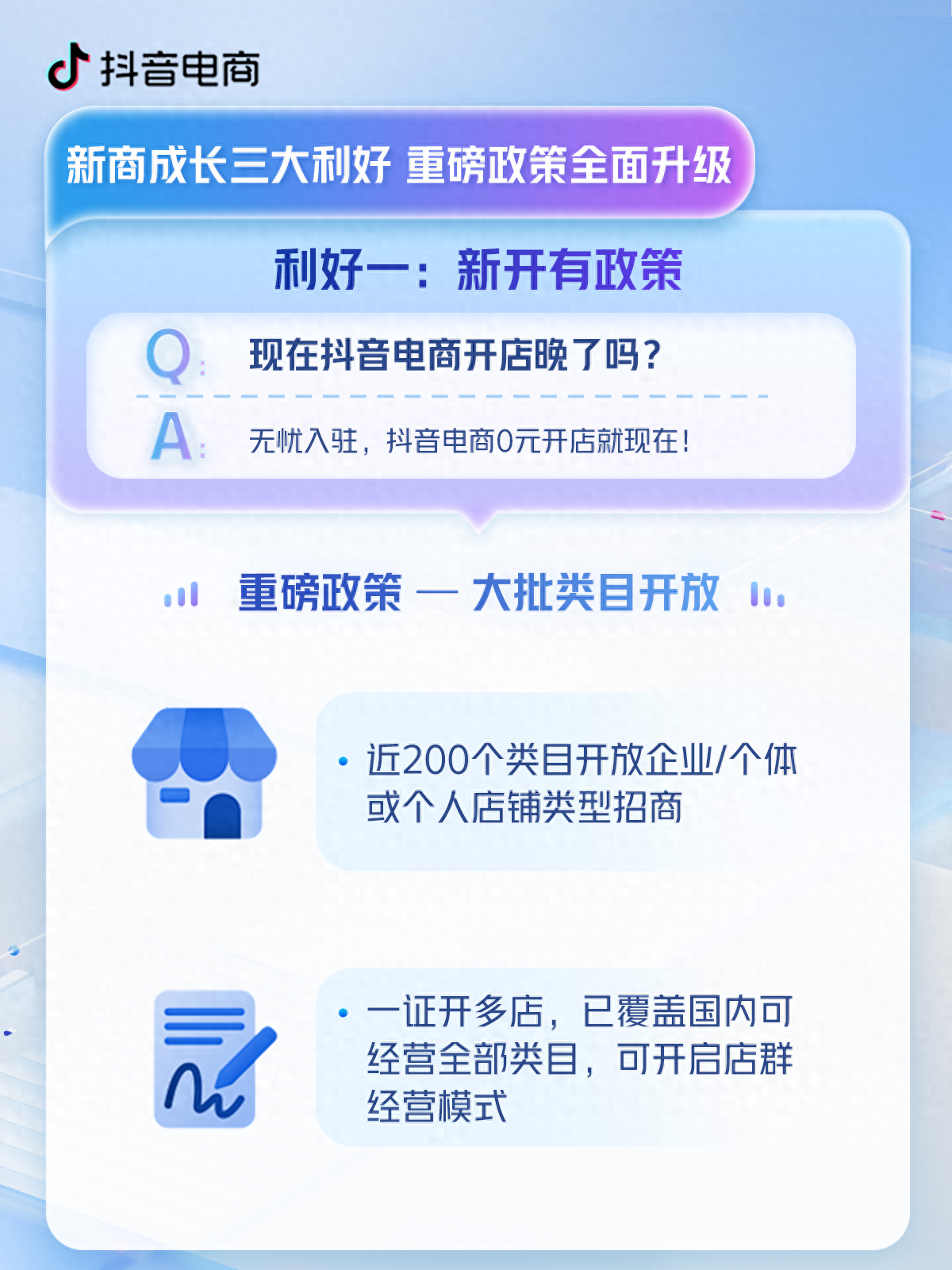 更值得一提的是,抖音电商还新出了一大重磅政策:新增近 200 个类目开放企业/个体或个人店铺类型招商,使更多商家圆梦开店。例如,部分滋补保健类目招商方式由企业店&个体店定准转为开放;内衣泳衣部分类目增加个人店开放招商。同时,抖音电商也给那些希望扩大经营、多品类经营的商家放宽了门槛,一证开多店政策已覆盖国内可经营全部类目,商家们可以开启店群经营模式,多线布局,多点开花。