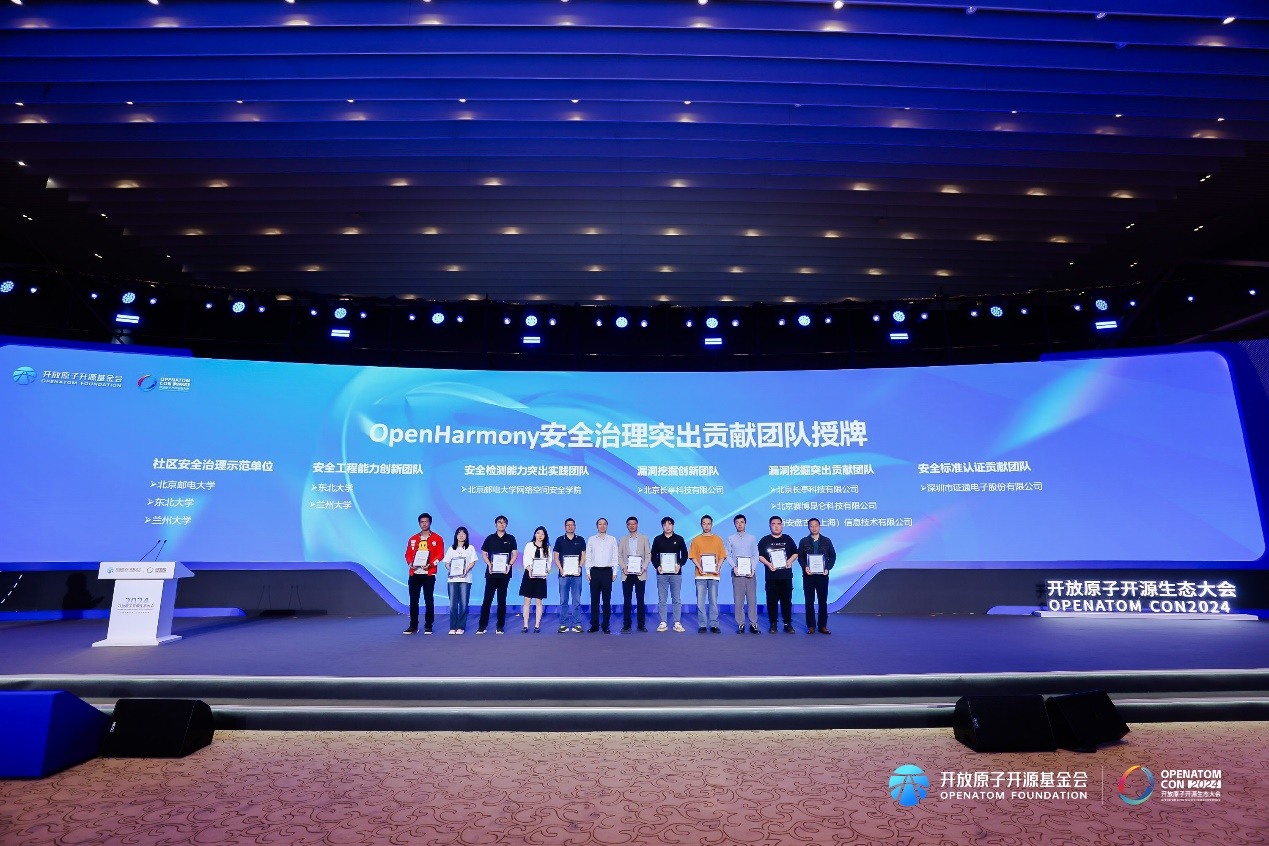 9 月 26 日,2024 开放原子开源生态大会 OpenHarmony 生态主题演讲在北京成功举办。在此次会议中,对为 OpenHarmony 开源社区安全治理作出杰出贡献的团队和个人进行了授牌,以表彰他们在社区安全治理工作中的卓越贡献,为 OpenHarmony 社区的安全稳定提供了有力保障。