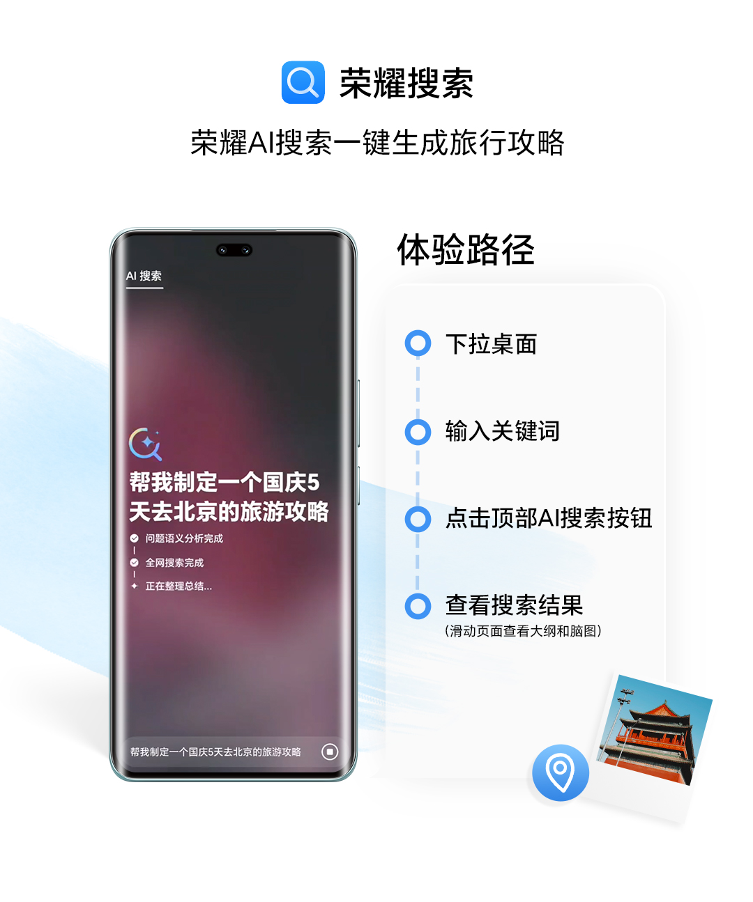 出发前,使用荣耀 AI 搜索快速生成个性化旅游攻略。下拉桌面-输入关键词,如「北京五天游玩攻略」,点击顶部 AI 搜索按钮,即可生成一份详细的旅游规划,下滑阅览大纲和脑图,助你快速掌握旅行要点,行程安排轻松搞定!