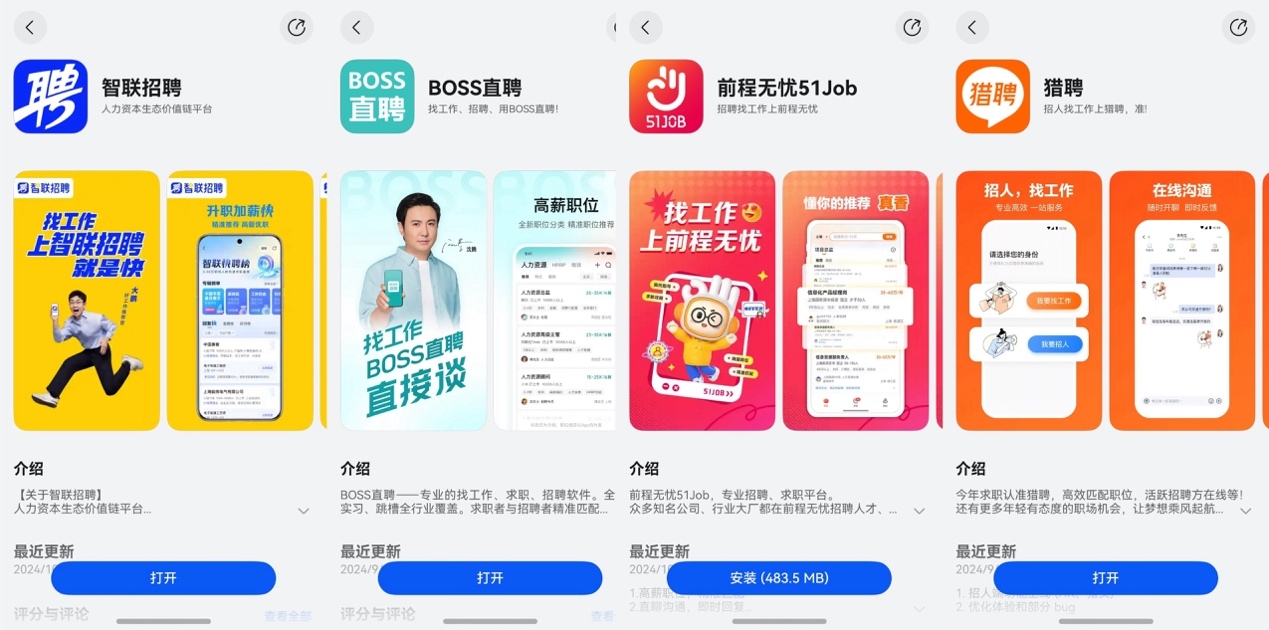 伴随 HarmonyOS NEXT 正式发布并开启更多机型公测,越来越多应用正在加快适配原生鸿蒙,基于全新的操作系统底座打造全场景时代的创新体验。其中智联招聘、BOSS 直聘、前程无忧 51Job、猎聘四款招聘应用已完成鸿蒙原生应用全量版本的开发,并上架 HarmonyOS NEXT 应用市场,推动全场景时代求职与招聘体验的创新升级,将吸引更多行业伙伴加入鸿蒙生态建设。