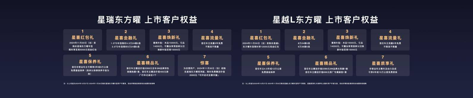 2024 年 10 月 27 日,文旅中国探索计划第二季暨中国星双旗舰上市发布会在西安举行,以一场现代科技与中国文化交相辉映、东方美学与汽车工业完美融合的盛典,创新演绎「国韵新生」。发布会上,吉利中国星东方曜正式上市,星瑞东方曜推出 1.5TD+7DCT 和 2.0TD+8AT 共五个版型,官方指导价为 9.97 万元-13.87 万元;星越 L 在现有车型上加新推出两款东方曜版型,星越 L 系官方指导价区间为 14.77 万元-17.97 万元。同时现在购买星瑞东方曜车型限时享至高 5000 元现金红包,购买星越 L 东方曜车型限时享 12000 元现金红包,以及金融、焕新、流量、保养、精品、质享等多重购车权益。