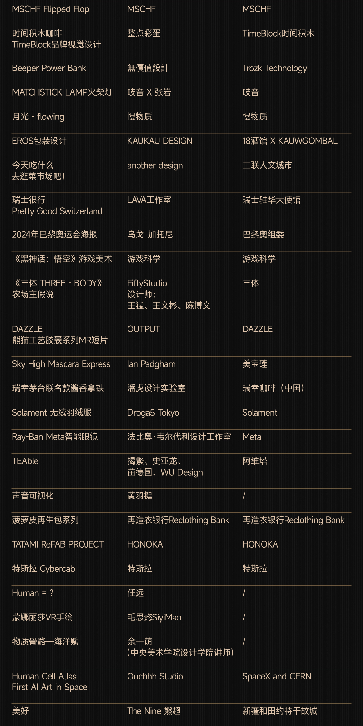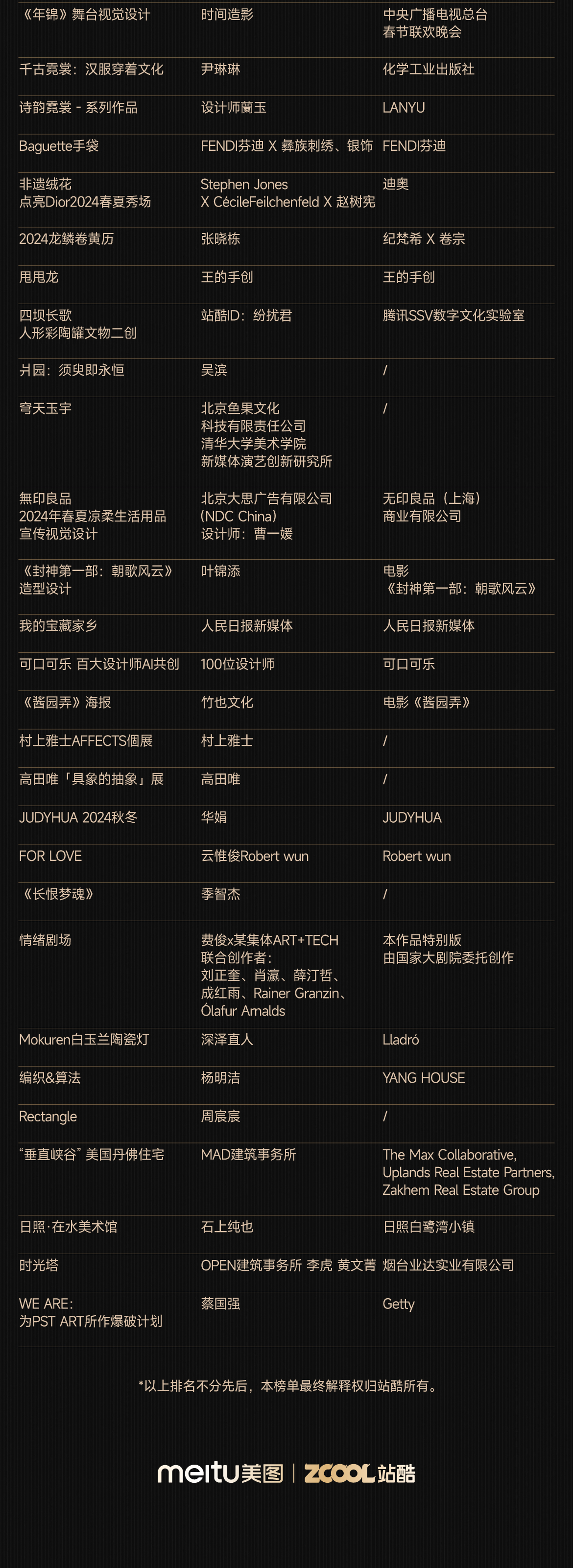 从上榜作品来看,2024站酷百大设计榜既坚守设计灵感与不同场景的契合和行业表达,又挖掘科技和设计融合的创新巧思,展现出2024设计行业最新趋势。