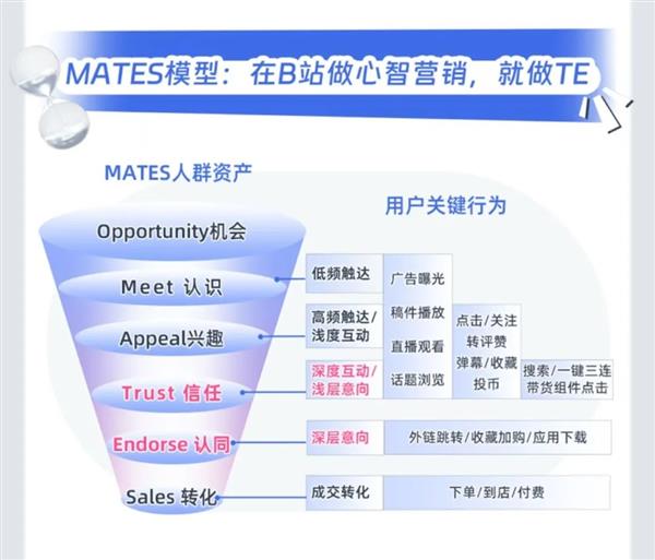 MATES 模型是 B 站基于营销行业通用的消费者行为模型,并融合 B 站社区优质中长视频、高用户黏性和强内容心智的平台特色而设计的。这一模型不仅科学量化了品牌在 B 站的人群资产,还通过数据驱动的科学方法论提高了营销的确定性。