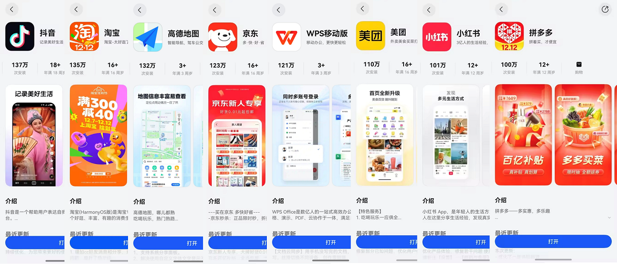 这些应用的安装量能在这么短的时间内猛增,其实是有迹可循的,从使用需求来说,这些应用涉及了我们日常生活中衣食住行娱等各个方面,已经成为了不可或缺的必需品。而在使用体验方面,自从上架原生鸿蒙应用市场以来,这些应用就在不断创新升级,给用户带来了更便捷更智能的使用体验。