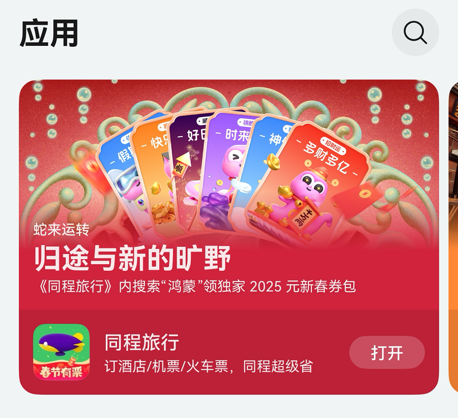 春节将至,一波新的出行高峰又将到来,近日鸿蒙原生版同程旅行上线了价值 2025 元的鸿蒙用户专享券包,在同程旅行 App 内搜索「鸿蒙」,点击「鸿蒙用户专享春节礼包」就能领取,有需要的朋友快来领取吧!