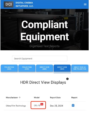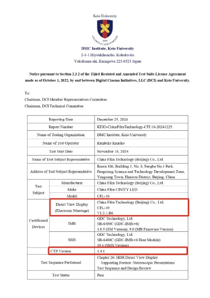 图为中影CINITY LED通过DCI CTP1.4.1认证公告