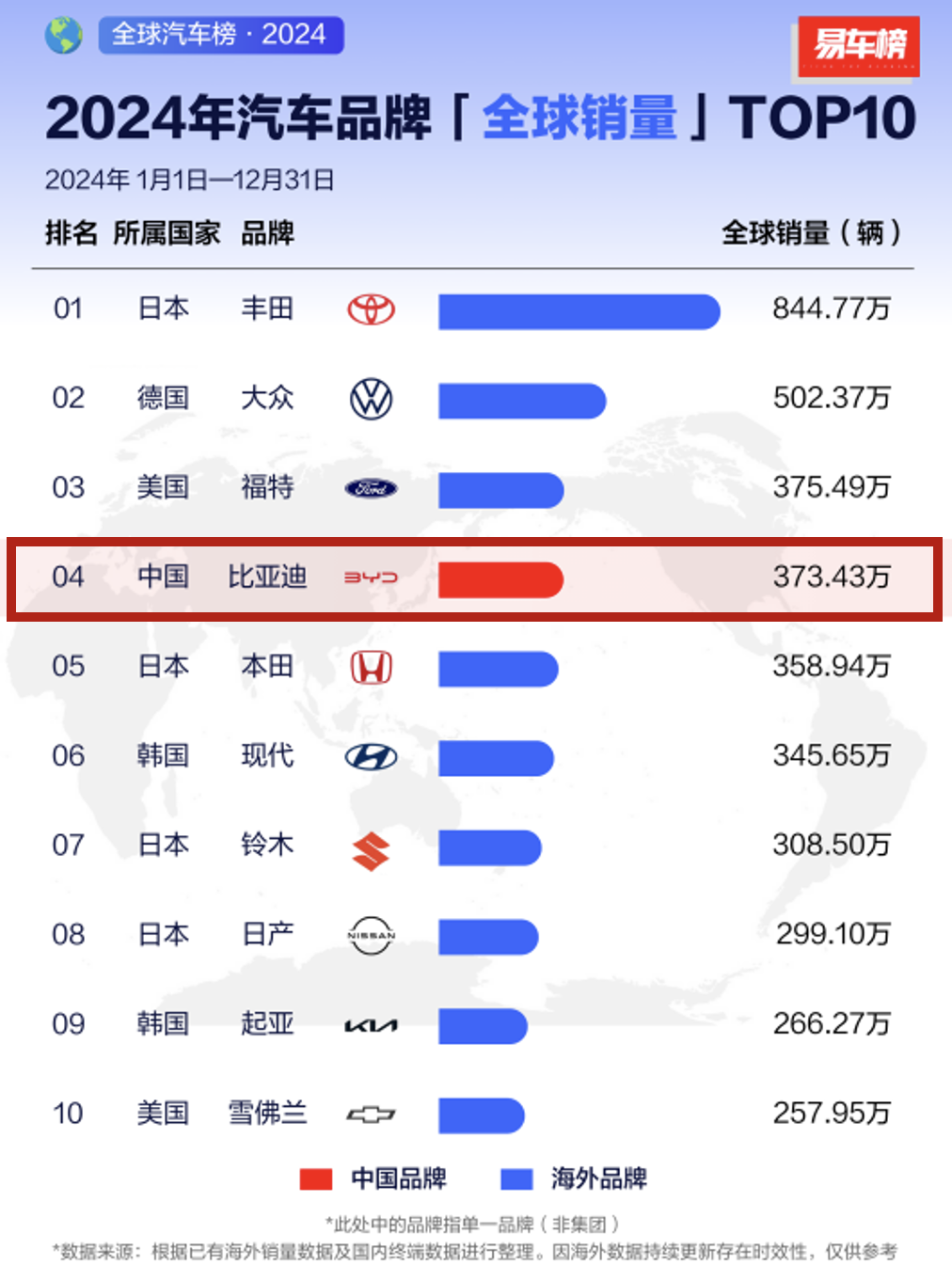 2025 年 2 月初,易车发布了「2024 年汽车品牌全球销量 TOP10」,比亚迪位列第四,较 2023 年的全球第 10 名,跃升了 6 位,这一成绩彰显了比亚迪的全球竞争力。