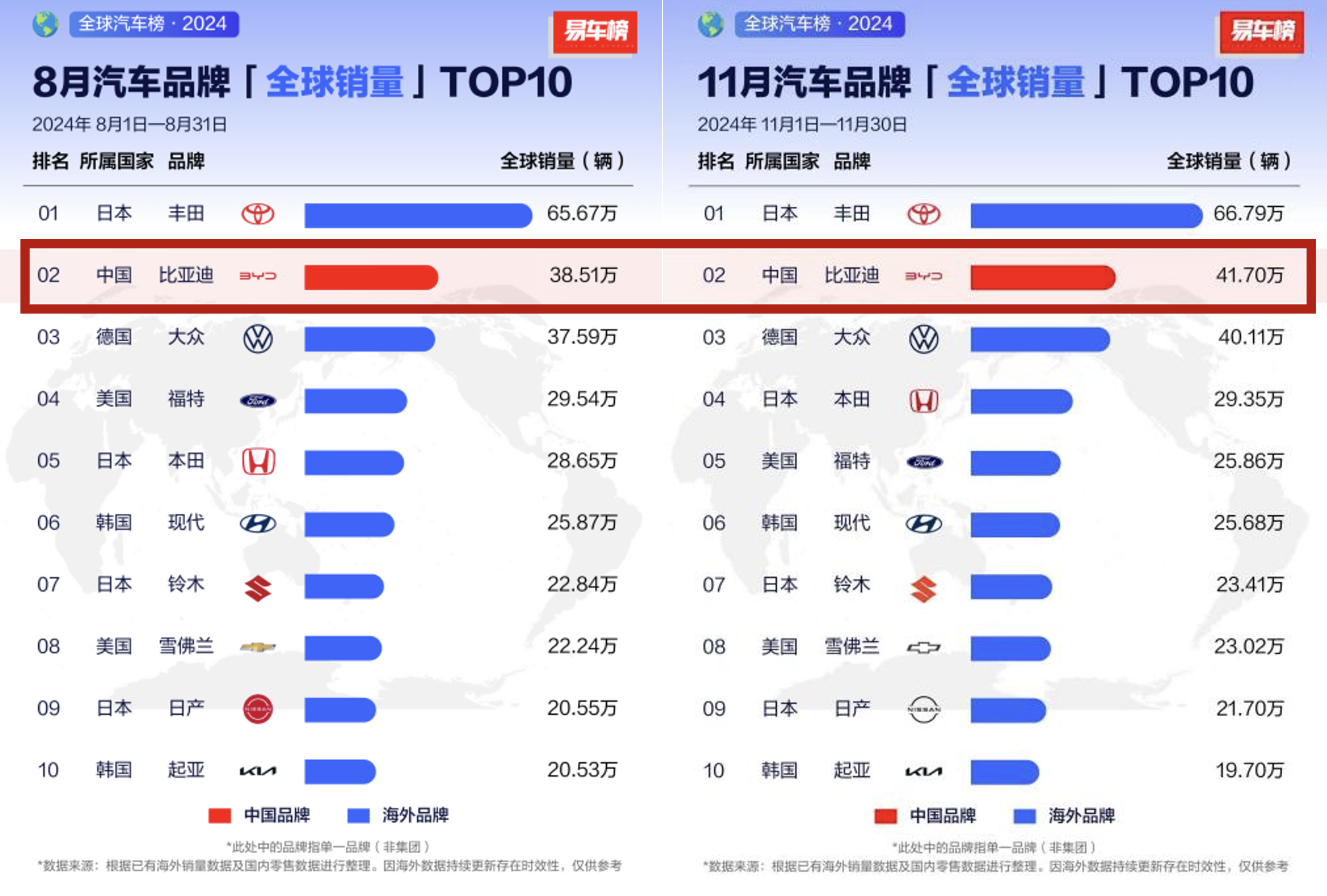2024 年,易车公布的全球汽车品牌销量 TOP10 榜单中,比亚迪在 8 月、11 月,均斩获了第 2 名的佳绩。