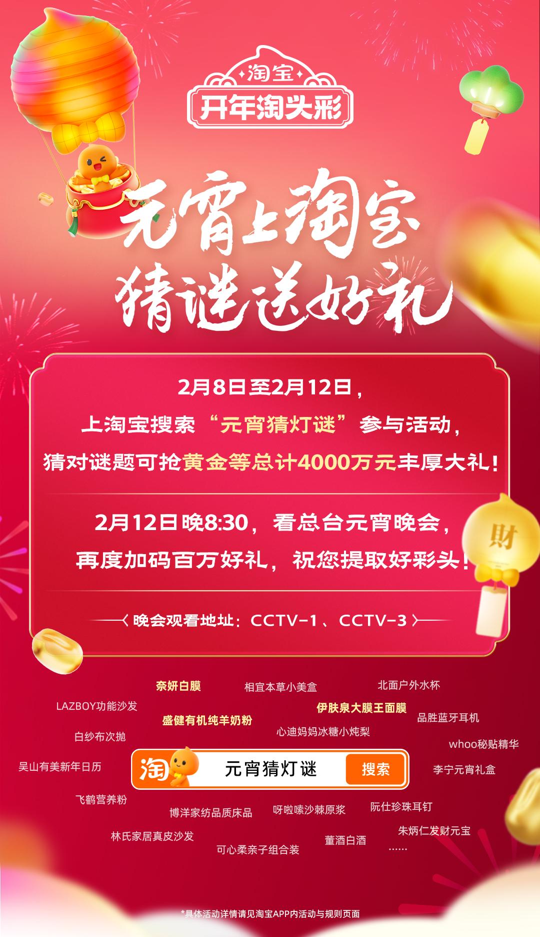 此次活动结合了淘宝刚刚上线的「送礼」新功能,在 2 月 8 日至 2 月 12 日期间,用户上淘宝 App 搜索「元宵猜灯谜」,就能在线猜灯谜,瓜分黄金等 4000 万元好礼。