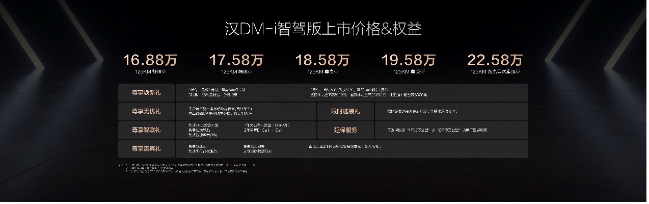 其中,汉 DM-i 智驾版共推出 5 款车型,售价 16.88 万~22.58 万元;汉 EV 智驾版共推出 5 款车型,售价 17.98 万~23.58 万元,开创 B+C 级轿车全民智驾,加配不加价!