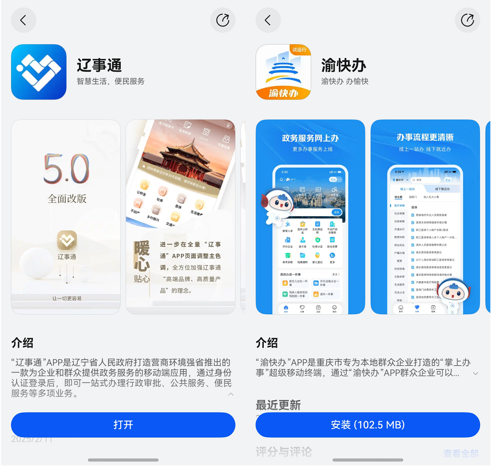 作为地方政务服务的核心入口,「辽事通」App 发布 5 年累计访问量突破 150 亿次,平均每月有 300 余万人在线办理业务,堪称「辽宁省企业群众移动办事的总门户」。「渝快办」则是重庆市着力建设的一体化政务服务平台,注册用户已达 2600 万,涵盖行政审批、社保医疗等近百项服务。