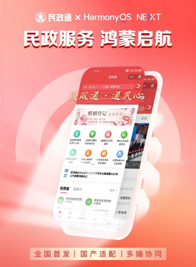 基于 HarmonyOS NEXT 创新底座,「民政通」鸿蒙原生 APP 客户端通过全图形栈支持 GPU Turbo 技术,实现应用流畅度提升的同时终端内存占用降低。此外,客户端支持自适应布局与动态字体,全面适配鸿蒙原生操作系统终端设计标准和技术要求。用户可通过华为手机「我的华为」-「升级尝鲜」体验完整的鸿蒙生态服务,并通过华为应用市场下载安装体验「民政通」应用。
