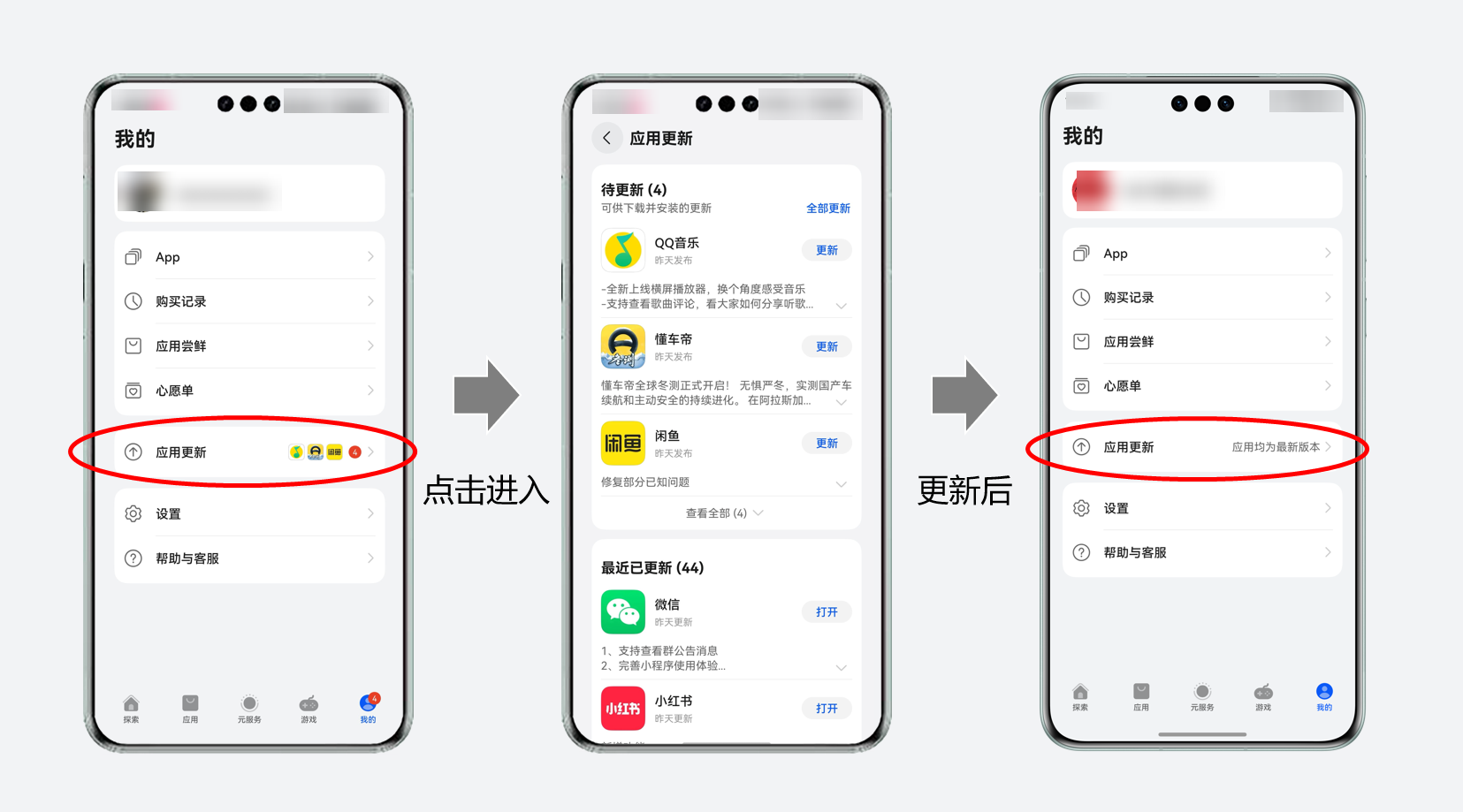 那更新列表去哪里了呢?点击进入「应用更新」,你可看到:应用更新列表在这里,且已分成了「待更新」和「最近已更新」两部分展示。「待更新」可提醒大家进行应用升级,「最近已更新」列表能帮助大家随时查看更新记录,了解应用更新后的新特性。