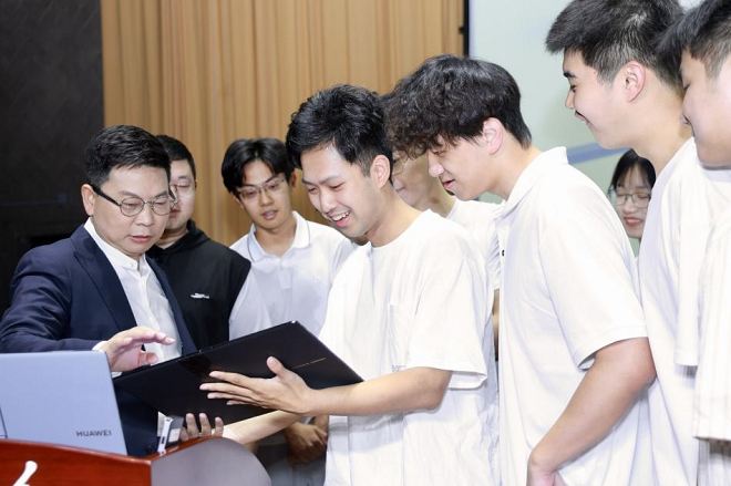 课前,余承东向学生代表现场演示了华为首款鸿蒙折叠电脑——HUAWEI MateBook Fold 非凡大师。凭借铰链与屏幕技术上的创新,鸿蒙折叠电脑兼顾了大屏与便携,在鸿蒙操作系统的加持下,整机体验更流畅、更安全、更智能。