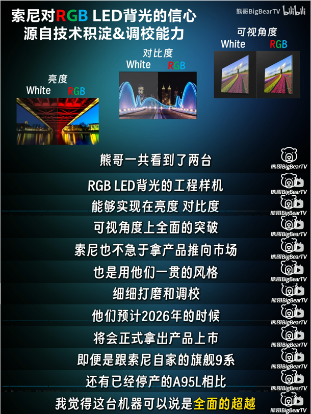 「从现场展示的灯板来看,索尼的 RGB 高密度 LED 背光系统灯珠密度比市面上的同类产品更高。(但是) 索尼向来不是单纯「堆砌硬件」的厂商,其背后的「秘密武器」是专门为这套背光开发的 IC 芯片和算法。在看到索尼 RGB 技术方案前,老马认为 RGB 背光主要是提升色彩,而索尼却通过「RGB + 独有技术」的多元整合,最终实现了液晶亮度、光晕控制(对比度)、可视角度的全方位提升。」——来源:科技有马