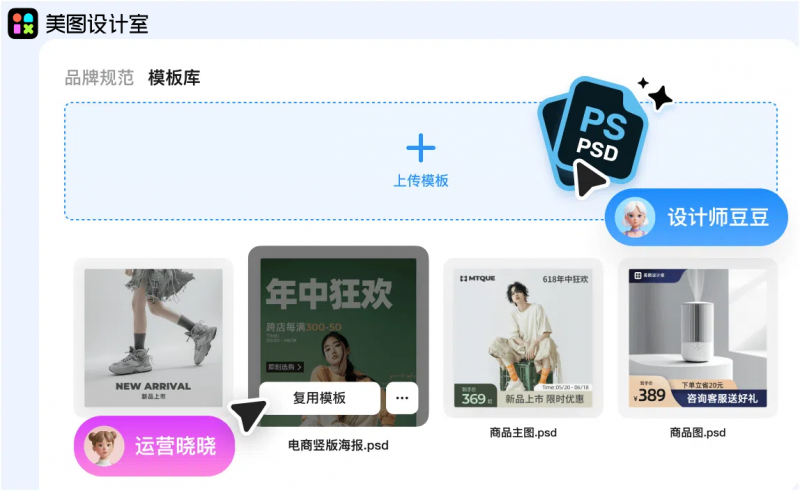 针对这一挑战,贝芯宠依托美图设计室团队版的模板快速复用能力,实现了高质量电商物料的大批量制作,具体操作过程中,专业设计师将设计好的 PSD 素材模板上传至模板库,运营人员只需修改文字、替换图片,即可快速产出小红书笔记、店铺宣传海报、朋友圈长图海报等各类物料。