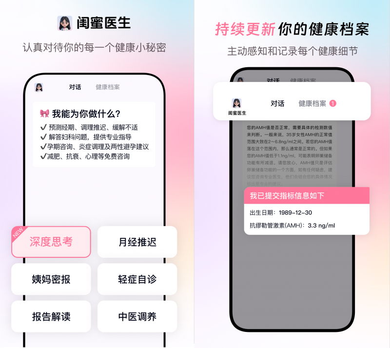 「豆蔻妇科大模型就像妇科 AI 医生,能为更多女性提供预问诊和健康管理服务」,壹生检康创始人王强宇说,「用户只要在闺蜜医生 App 对话界面勾选症状,就会得到专业的自诊结果,涵盖主诊断 +其他潜在诊断 + 检查项目建议 + 处置方案建议 + 注意事项说明等专业内容。相比传统在线问诊平均 30 分钟的等待时间,闺蜜医生能在数秒内生成专业建议,帮助女性快速判断是否需要紧急就医,尤其适合职场女性、偏远地区用户。