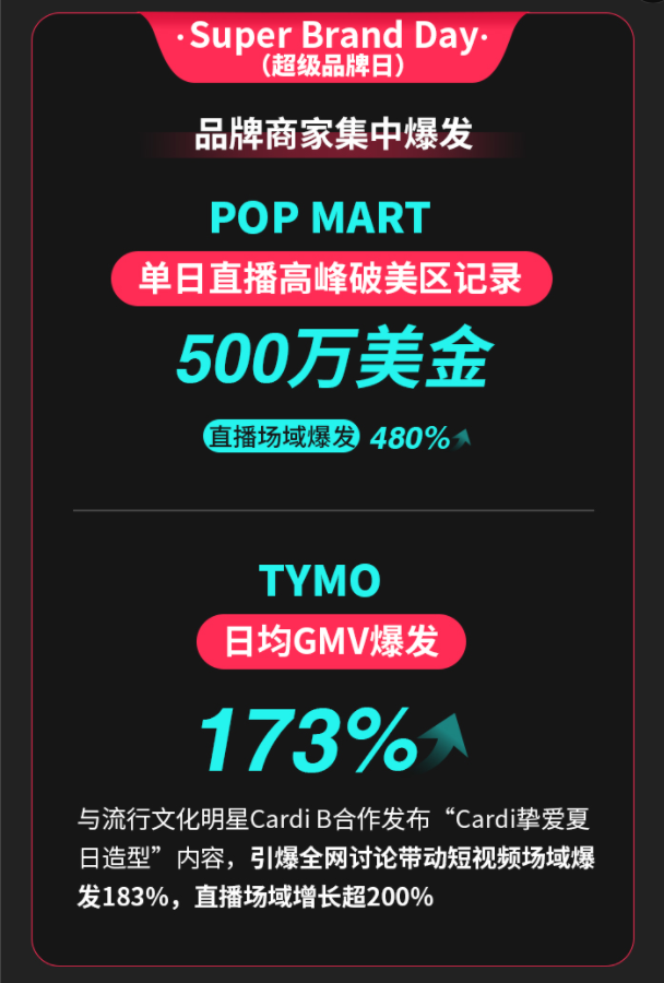 本次大促最亮眼的成绩来自商家自运营(POP)模式的内容场表现。作为参与超级品牌日的五个跨境商家之一,POP MART 单日直播 GMV 突破 500 万美元,刷新美区直播纪录;实现直播间万人同时在线。美妆工具品牌 TYMO 与 Cardi B 合作发布「Cardi 挚爱夏日造型」内容,带动短视频场域爆发 183%,直播 GMV 增长超 200%,明星营销赋能带动销售额增长近 2 倍。