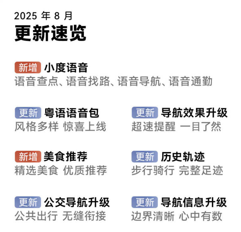 为持续优化智能导航服务,提升用户体验,鸿蒙版百度地图于近日完成新一轮更新,新版本不仅新增小度语音及美食推荐功能,更在导航效果、历史轨迹、公交导航、语音包等核心板块实现全面迭代,旨在为用户带来更加精准便捷、更加个性化的导航服务。