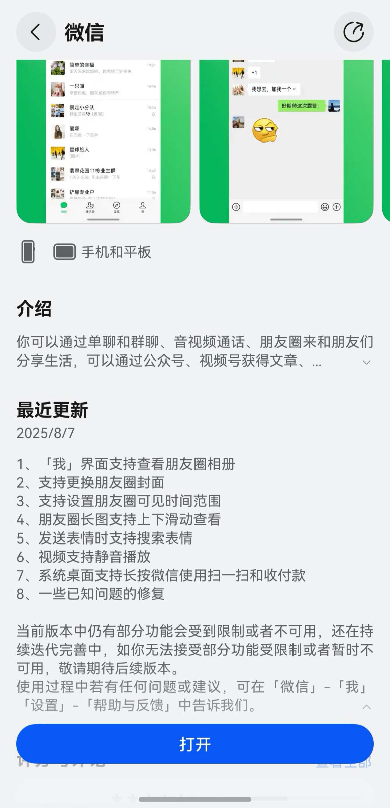 目前该版本也已上架平板端应用市场。鸿蒙版微信正以更快的迭代速度,将用户需求变为现实,使用体验渐趋完善,也因此收获了越来越多用户的喜欢和好评。目前鸿蒙版微信安装量已突破 1100 万,快去应用市场更新,享受更智能、更便捷的社交体验吧!