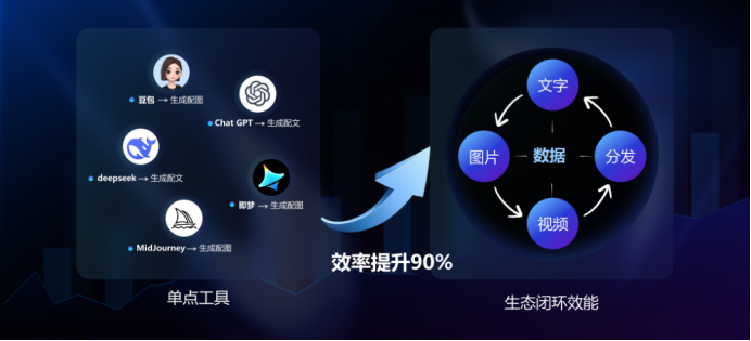 「这四个模块并非简单叠加,而是通过数据流和策略联动形成闭环。」施海天强调,其核心逻辑可概括为「内容跟着数据走,分发跟着内容定,直播跟着用户变,数据盯着全流程,四个模块数据互通、策略联动,形成一个不停自我调整的循环,相较于营销单点工具的『散兵游勇』状态,生态级智能体中枢更像是『能协同作战的智能军团』,通过模块协同、数据闭环、自动迭代三大技术优势,实现业务抗风险与 1+1>2 的效果。」