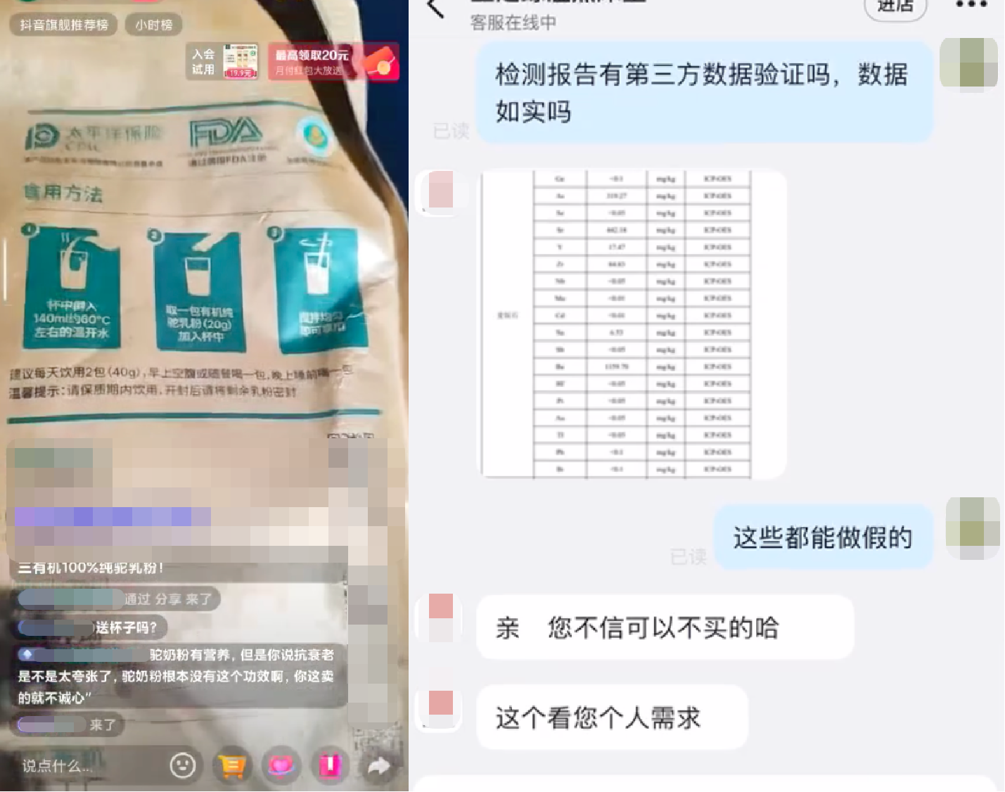 8 月 20 日,AI 医疗打假应用 AQ 发布「十大虚假医疗广告名单」冲上热搜,磁疗床垫、灵芝孢子粉、羊胎素等保健品涉嫌虚假宣传,惹怒网友,纷纷冲进相关涉嫌产品直播间、评论区,质问主播和客服并为被骗的亲友鸣不平:「我爸妈就是被你们骗了!相关许可怎么都没有?你这就是三无产品!」面对质疑,多位主播和客服的回应模棱两可,更有甚者把网友拉黑,踢出直播间。