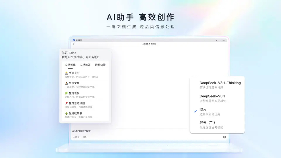 AI 文档助手,创作更高效:唤起 AI 文档助手,即可一键生成文档、PPT、数据表格、思维导图甚至信息收集表,多种专业模版任选,大幅节约创作时间。