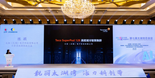 在成果发布环节, 太初 (无锡) 电子科技有限公司 (简称「太初元碁」) 打造的 Teco SuperPod 128 高密液冷智算集群作为重大创新产品亮相。