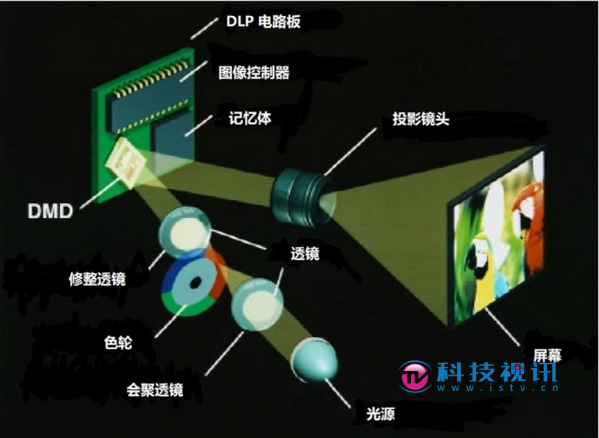比如 DLP 技术,借助高速旋转的色轮,令红光、绿光、蓝光依次投射在 DMD 上,借助人脑会自动合成三色画面的特点成像。
