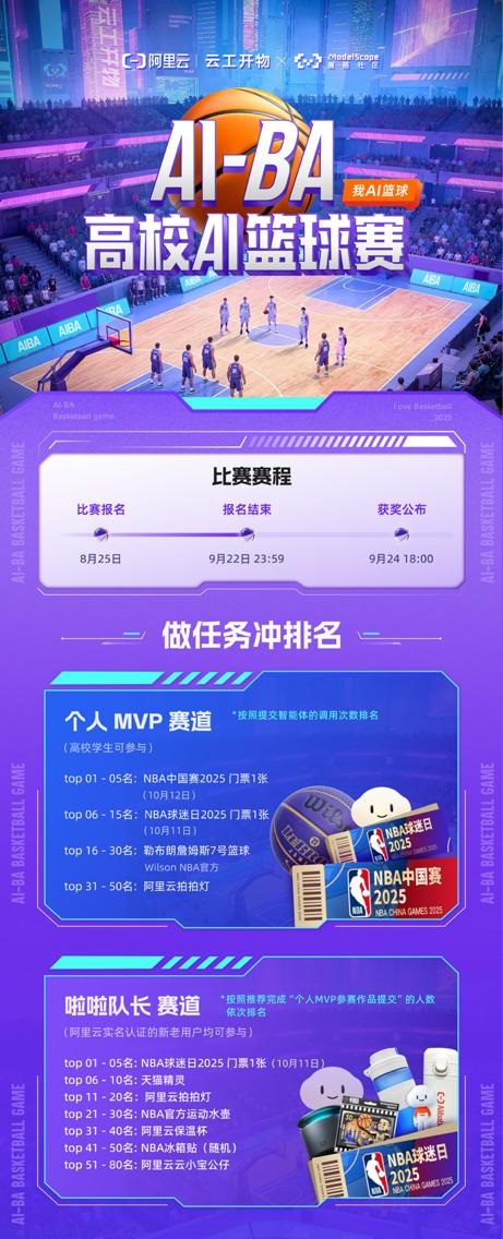 能玩又能学,还能赢大奖!邀你与 AIBA 的篮球文化传播官一起,用 AI 技术科普篮球文化,传递篮球精神!来冲刺属于你的篮球排名吧,NBA 中国赛 2025 门票、NBA 官方周边、阿里云周边等百余份好礼等你冲!更多活动信息可关注「阿里云高校合作」公众号获取。