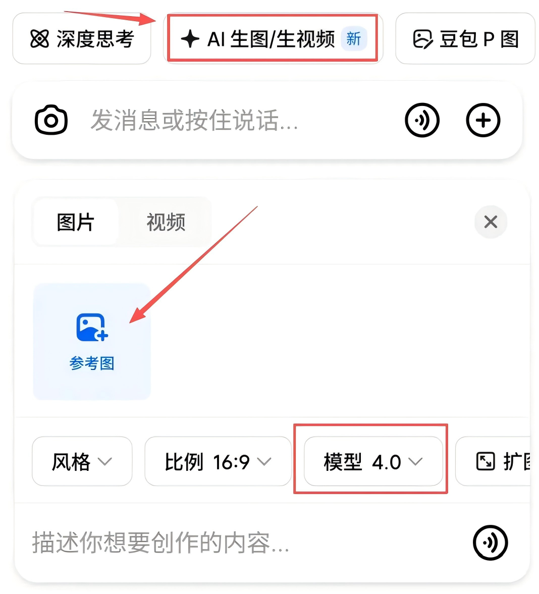 使用方法也很简单,打开豆包,直接点击下方的「AI 生图/生视频」。