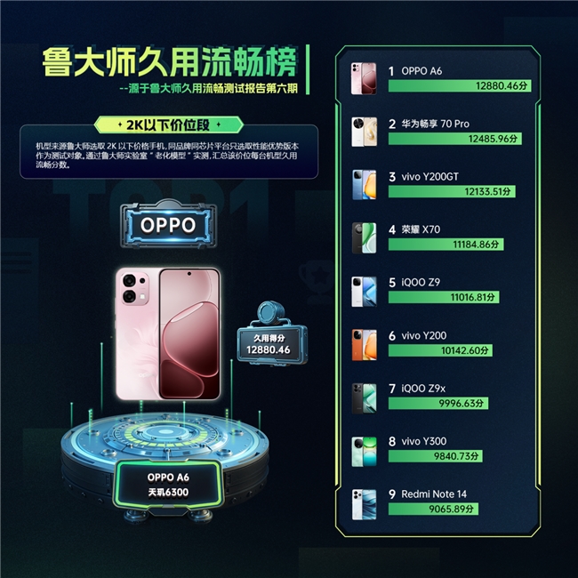 不妨看看刚上市的 OPPO A6 系列。作为大众机型,它的两款机型分别聚焦 2K 以下和 2K-2.5K 价位,符合主流消费需求;可让人意外的是,在行业最严格无水分的鲁大师久用流畅测试中,它俩却在两个价位段中都拿下了久用流畅第一名的成绩,实实在在打破了大众机型「用久必卡」的行业固有认知。