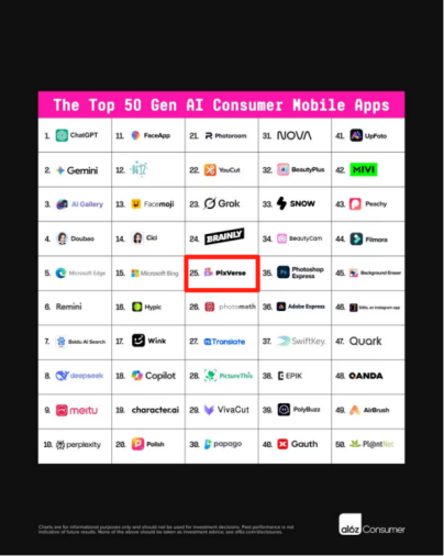 与此同时,PixVerse(拍我AI)入选a16z“全球Top 50生成式AI消费移动应用”榜单第25位,全球用户AI视频消费实力强劲。