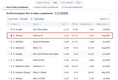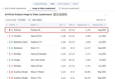 9月7日,根据权威独立测评平台Artificial Analysis最新测试结果,爱诗科技发布的PixVerse V5自研视频生成大模型,在图生视频(Image to Video)项目榜单中登顶全球,在文生视频(Text to Video)项目榜单中位列Top2,技术实力保持在全球第一梯队。