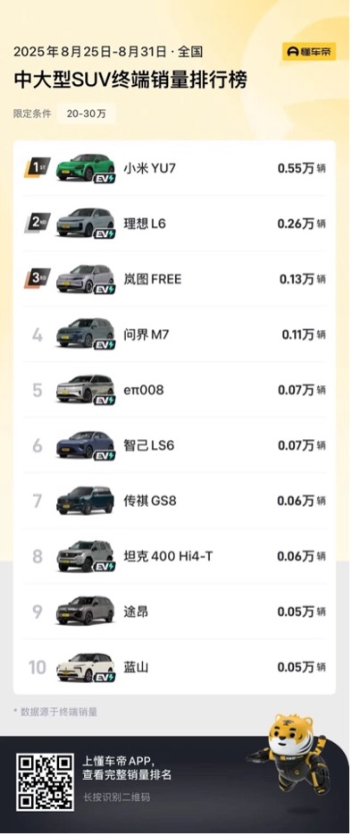 2025 年 8 月中国新能源 SUV 市场再掀波澜,高能榜单重磅出炉,20-30 万元中大型 SUV 赛道正式迎来「小理华」新格局。岚图 FREE+以 5,239 辆 的月销成绩,强势跻身细分市场 Top3,与小米 YU7、理想 L6 并肩而立,形成「小米、理想、岚图(华系代表)」三强鼎立的竞争新态势。