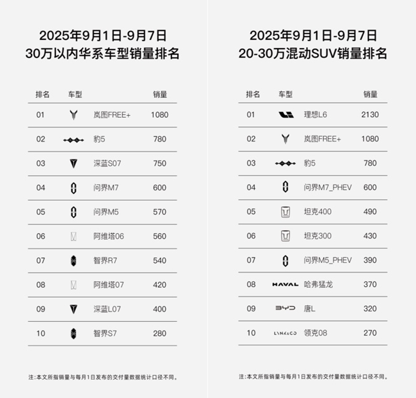 尤其在 8 月最后一周(8 月 25 日-31 日),岚图 FREE+单周销量再攀高峰,达到 0.13 万辆,紧随理想 L6 与小米 YU7 之后,牢牢锁定 20-30 万元中大型 SUV 零售榜 Top3。金秋九月,岚图 FREE+延续强势,以 1080 台佳绩再夺「30 万内华系车型销冠」,稳居 20-30 万混动 SUV 市场 Top2,展现出强劲的爆款势能与持续的市场渗透力。