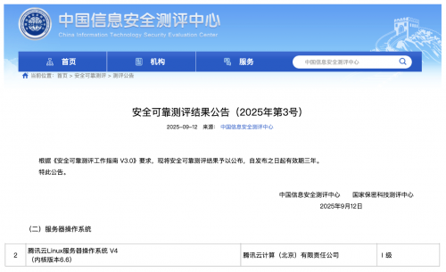 腾讯云 Linux 服务器操作系统(TencentOS Server)V4(内核版本 6.6)顺利通过测评,并获得安全可靠等级「I 级」。